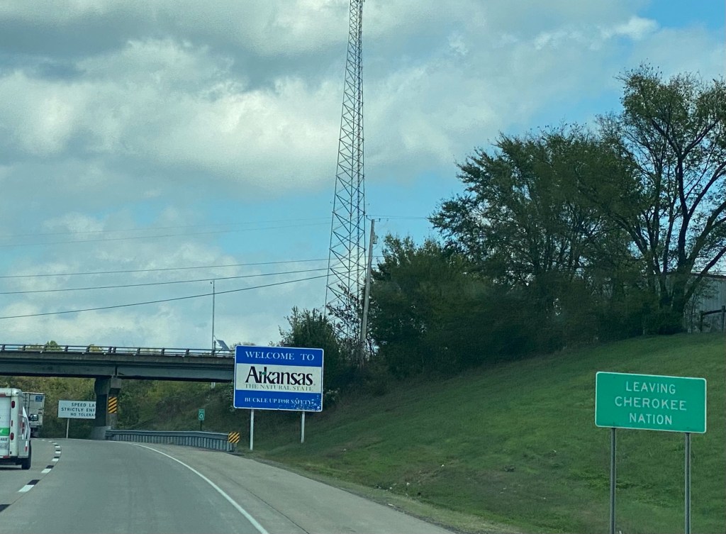Traffic was light, and the construction sites weren’t too congested. I-40 East in Oklahoma is an interesting ride…kind of like riding over corrugated roads. It definitely made for some interesting unpacking and opening this evening. So far, I-40 East in Arkansas is smoother. Rest areas and kind of sparse out this way – so thankful we have our own!